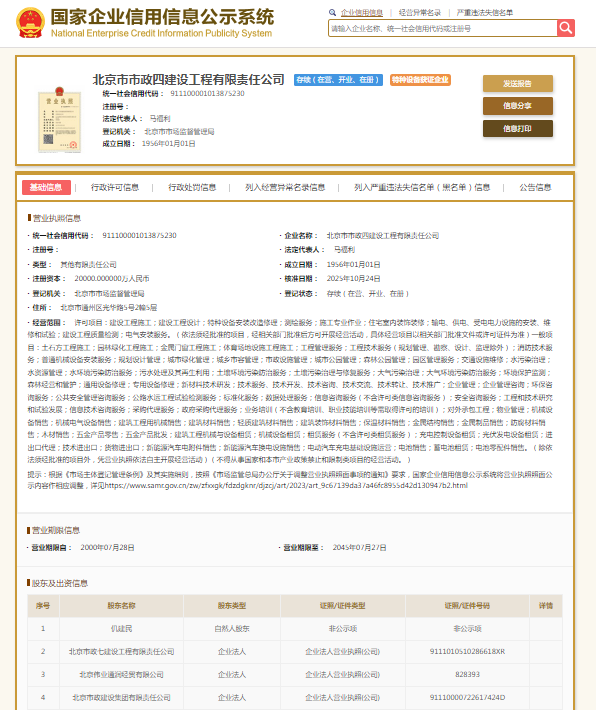 北京市市政四建设工程有限责任公司则成立于1956年,注册资本20000万元人民币,法定代表人马福利,大股东为北京市政建设集团有限责任公司。