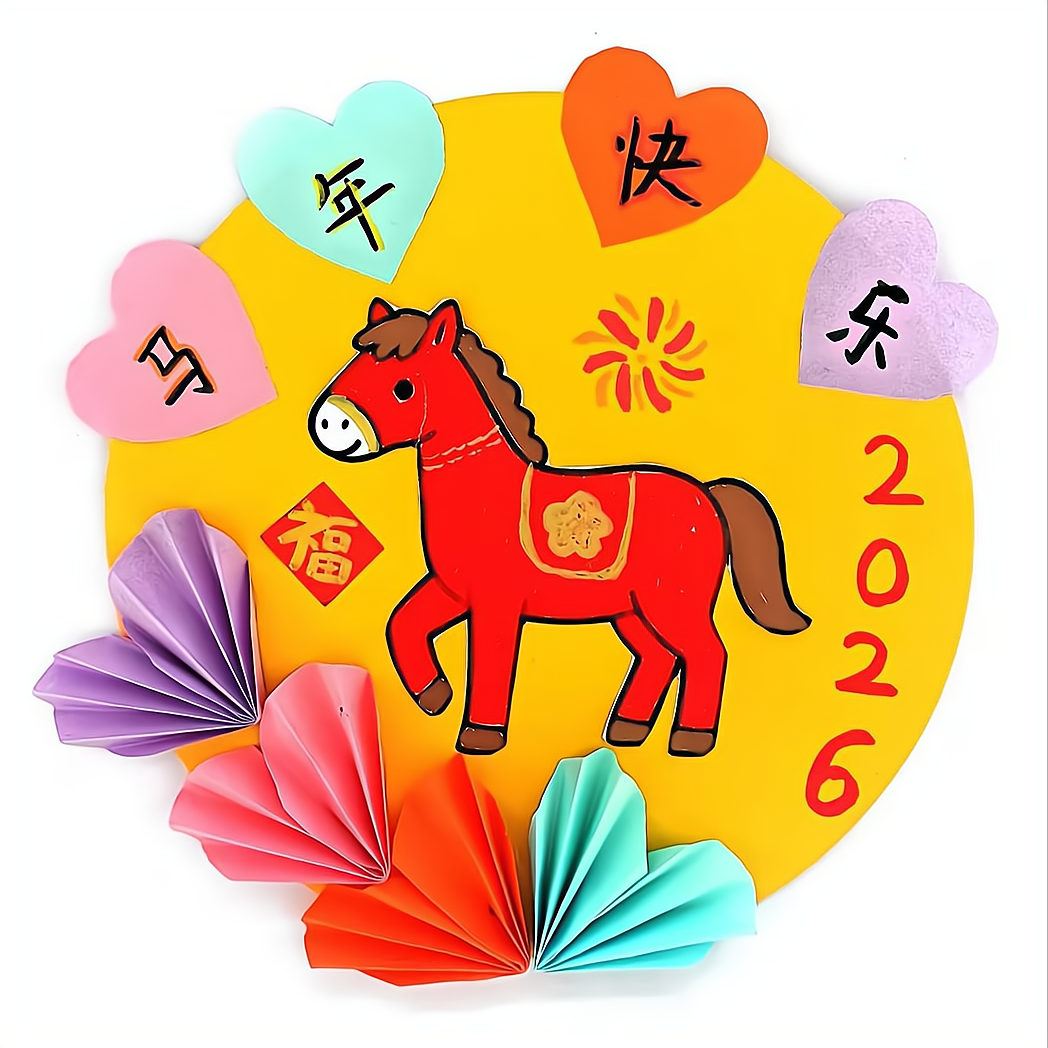 本作品以2026丙午马年为主题,用剪纸、折纸与手绘结合,传递出少年纯真的祝福。既呼应了生肖文化,也表达了对2026年的美好期盼。