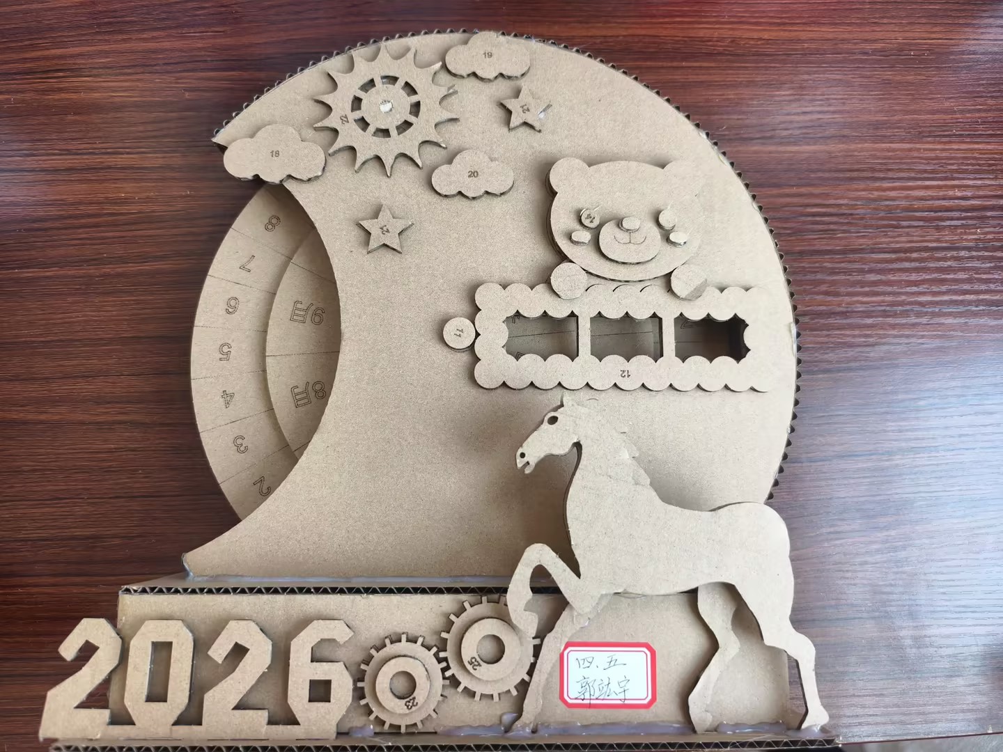 本作品以瓦楞纸为材料,打造出充满机械感的立体装置:奔跑的骏马、可爱的小熊与可转动的日历齿轮,既体现了“马”的主题,又兼具实用功能,手工质感十足,充满童趣与巧思。