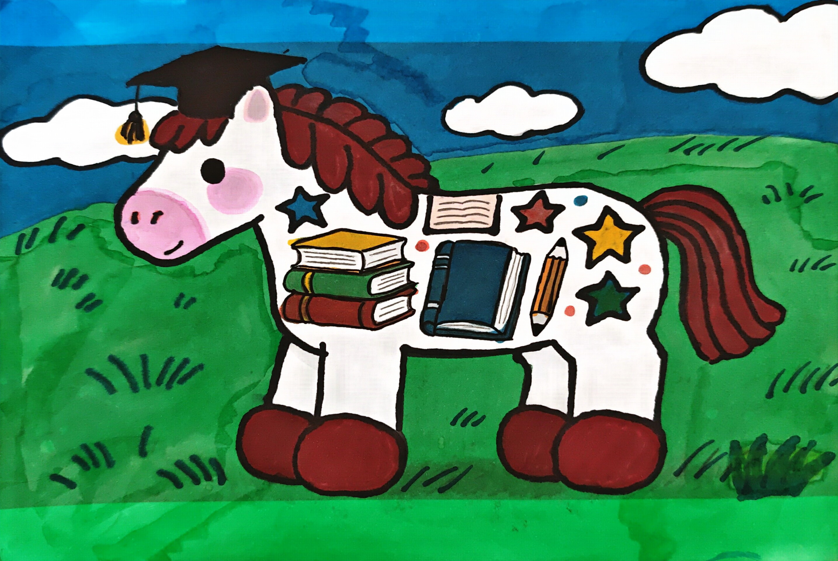 本作品线条简洁饱满,色彩鲜亮明快,画中小马身上堆满了书本与纸笔,像是满载着知识和智慧,寓意少年在学习路上奋勇向前的姿态。
