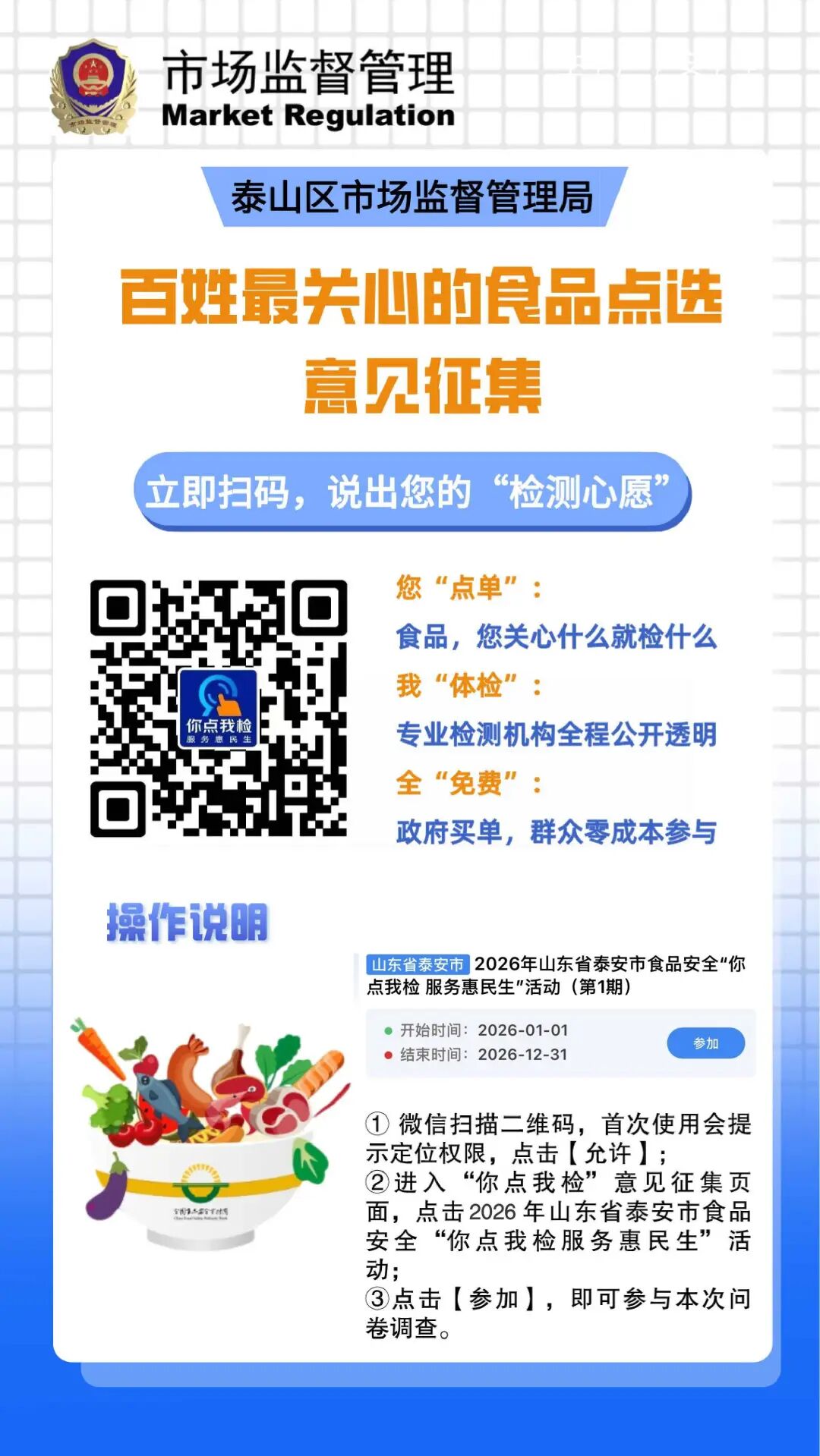 食品安全是民生底线,餐桌安全需全民共建! 泰山区“你点我检”问卷征集活动火热开启,邀请您来“点”。