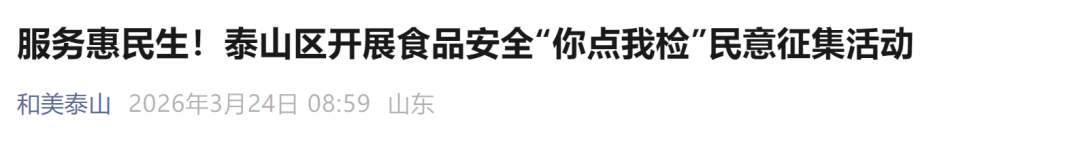 3月24日,和美泰山发布消息,泰山区开展食品安全“你点我检”民意征集活动,详情如下: