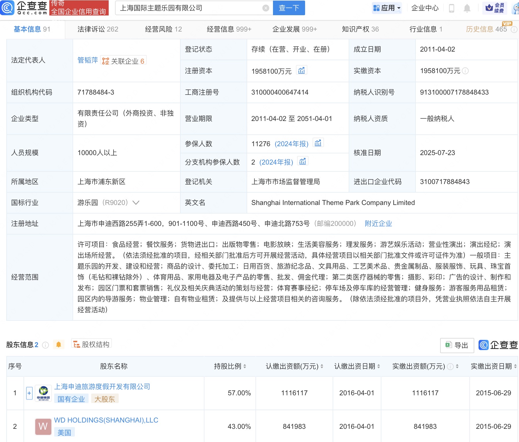 企查查APP显示,上海迪士尼度假区关联公司上海国际主题乐园有限公司成立于2011年4月,法定代表人为管韬萍,注册资本约195.8亿人民币,由上海申迪旅游度假开发有限公司等共同持股。法律诉讼信息显示,该公司曾因服务合同纠纷、娱乐服务合同纠纷、合同纠纷等被起诉。