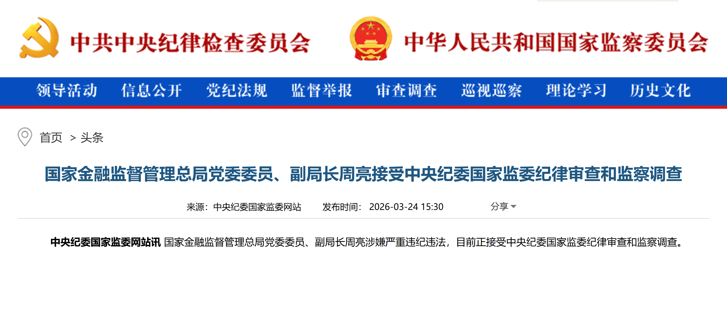中央纪委国家监委网站3月24日消息,国家金融监督管理总局党委委员、副局长周亮涉嫌严重违纪违法,目前正接受中央纪委国家监委纪律审查和监察调查。