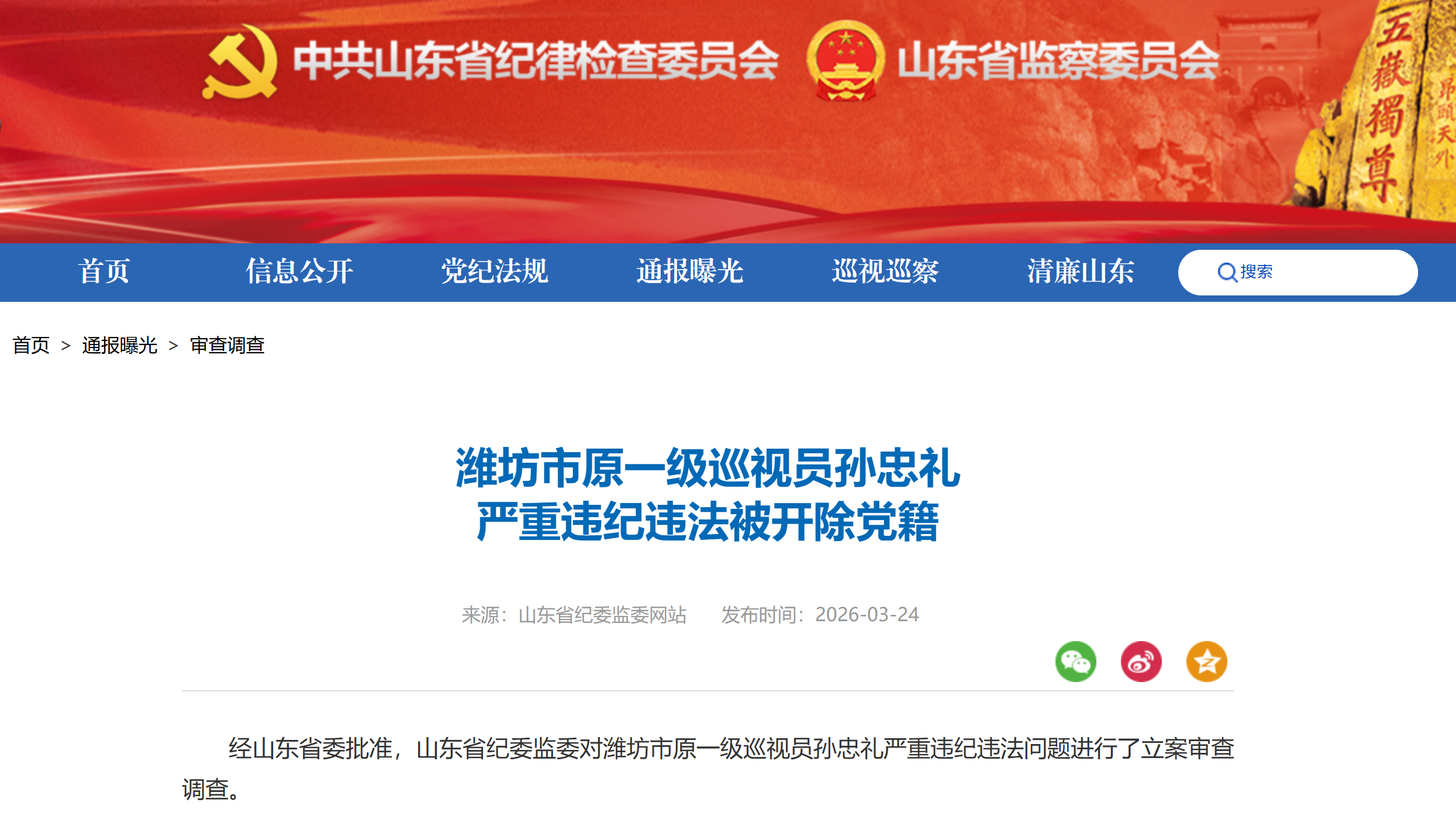 山东省纪委监委网站3月24日消息,潍坊市原一级巡视员孙忠礼严重违纪违法被开除党籍。