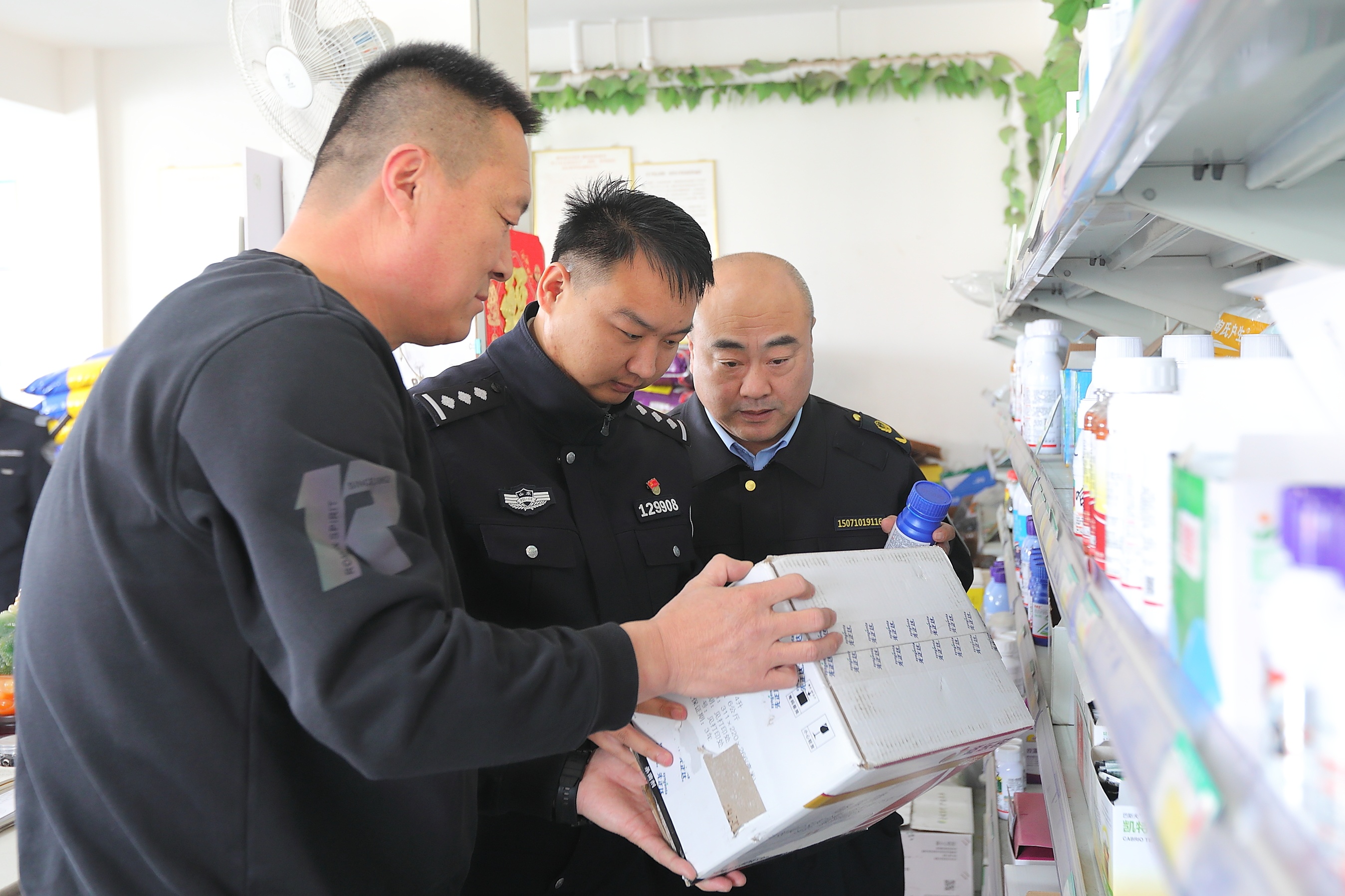 图为3月24日,安丘市公安局局环境资源与食品药品犯罪侦查大队民警与农业农村部门执法人员检查种子门市。