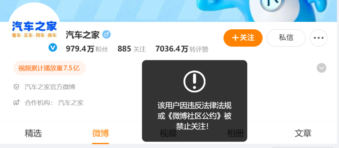 “汽车之家”多个社交平台官方账号被禁止关注,总粉丝超千万