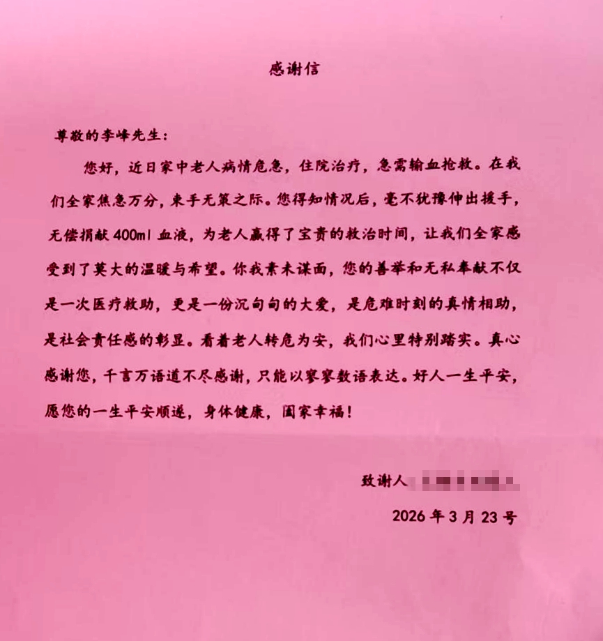 “你我素未谋面,您的善举和无私奉献不仅是一次医疗救助,更是一份沉甸甸的大爱,是危难时刻的真情相助,是社会责任感的彰显。看着老人转危为安,我们全家感受到了莫大的温暖……”老人家属在给李峰的感谢信中这样写道。字里行间,满是感激之情。