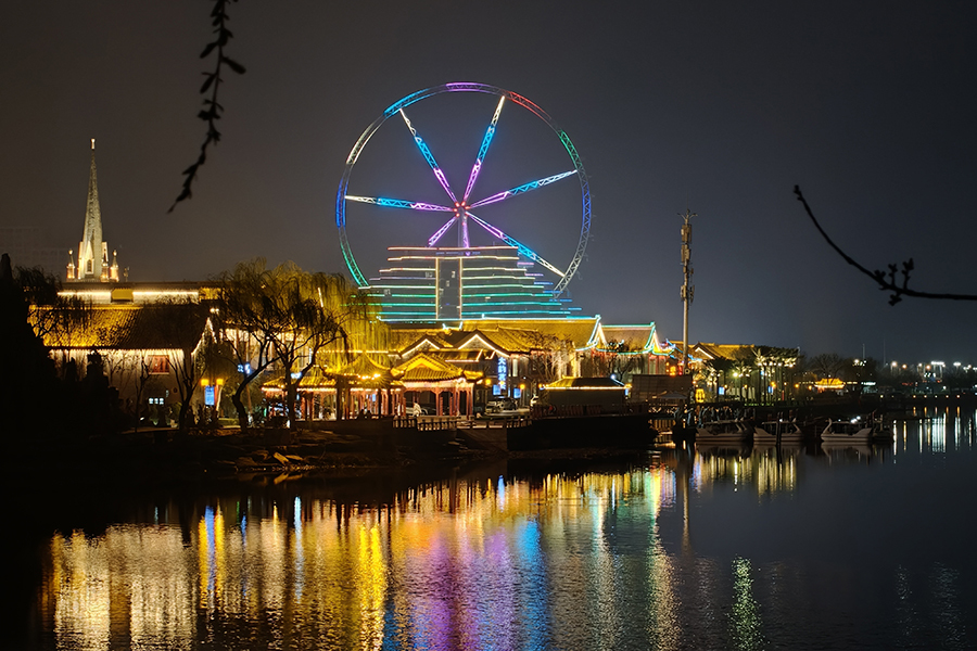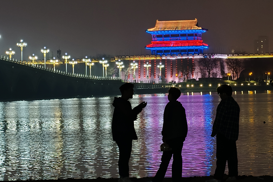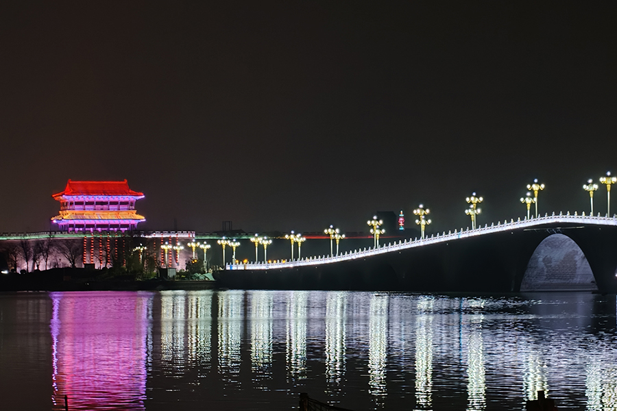3月22日晚,聊城市主城区流光溢彩。横跨水面的大桥、不远处建筑物的轮廓被灯光描摹,倒映水中,虚实之间,好似一幅幅画,尽显水城独特魅力。 文/图记者潘云磊朱全智
