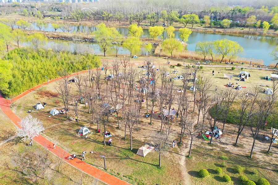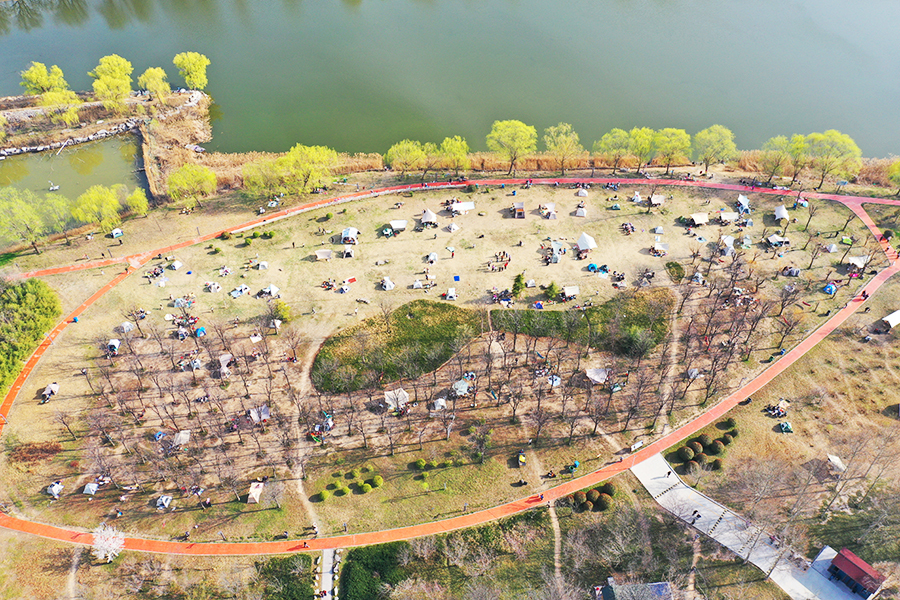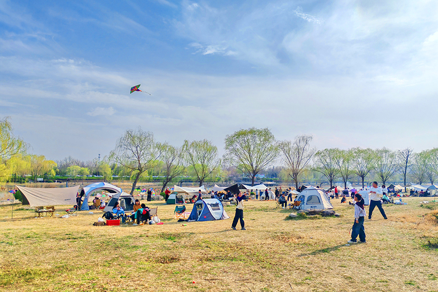 3月22日,春风和煦,万物复苏。聊城南郊徒骇河畔蓝天碧水、绿柳拂堤,不少市民支起帐篷、围坐闲谈,在鸟语花香中沉浸式感受自然之美,乐享春日露营时光。 文/图记者许金松