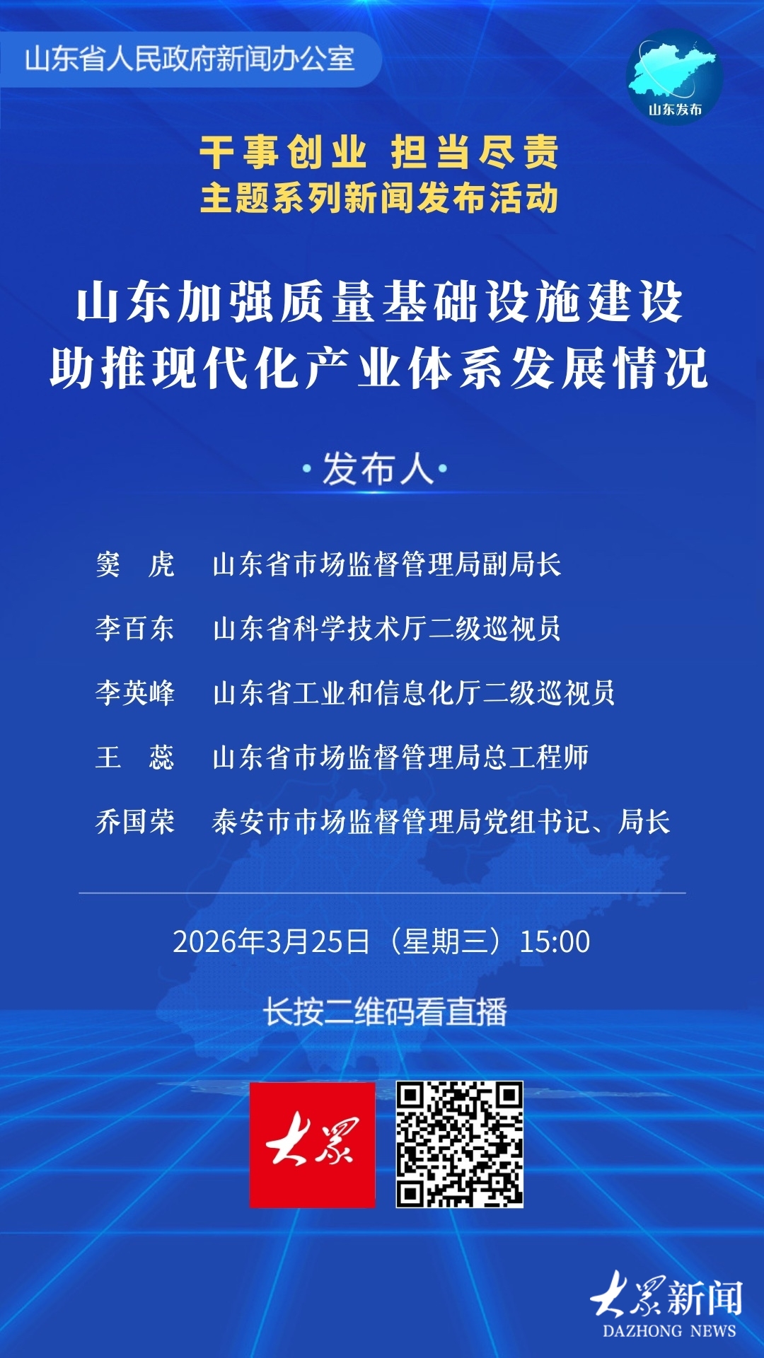 山东省人民政府新闻办定于3月25日(周三)15:00举行“干事创业担当尽责”主题系列新闻发布会,邀请省市场监管局负责同志等介绍山东加强质量基础设施建设,助推现代产业体系发展情况。(大众新闻记者崔晗高广超)