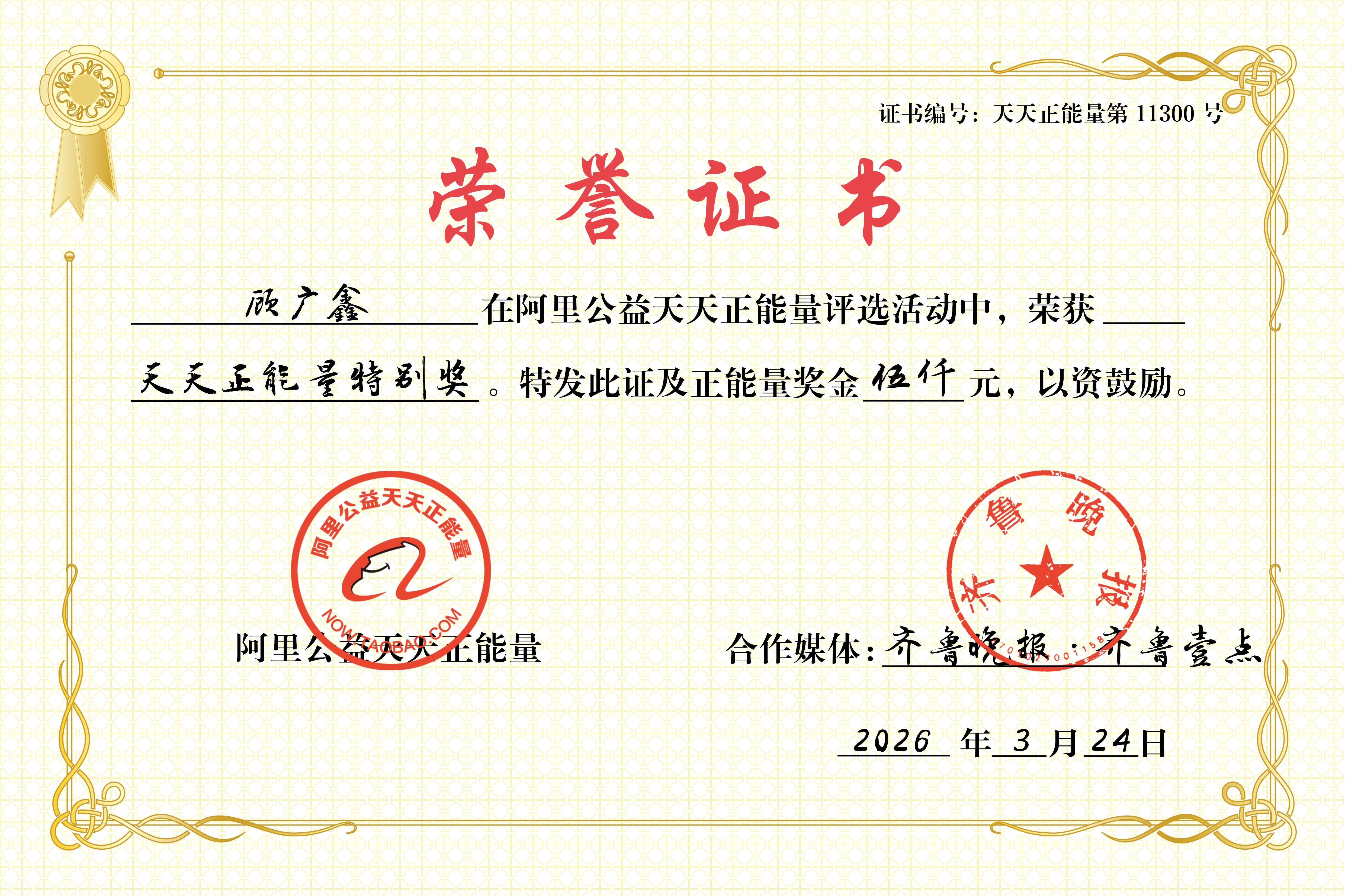 为弘扬社会正能量,致敬顾广鑫的救人义举,齐鲁晚报·齐鲁壹点联合阿里公益天天正能量,授予顾广鑫“天天正能量特别奖”,并颁发5000元正能量奖金。
