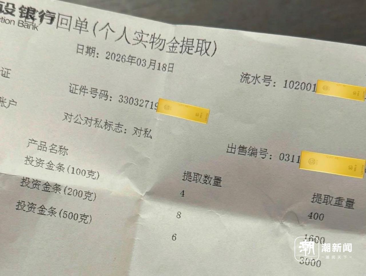 消费者展示购买的金条的单据。许恬 摄