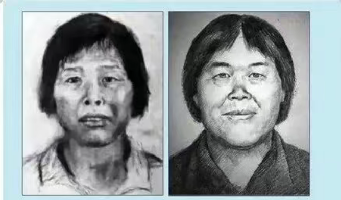 △图左(2017年,广东警方发布的第一张“梅姨”画像),图右(2019年,林宇辉画的“梅姨”新版画像)。
