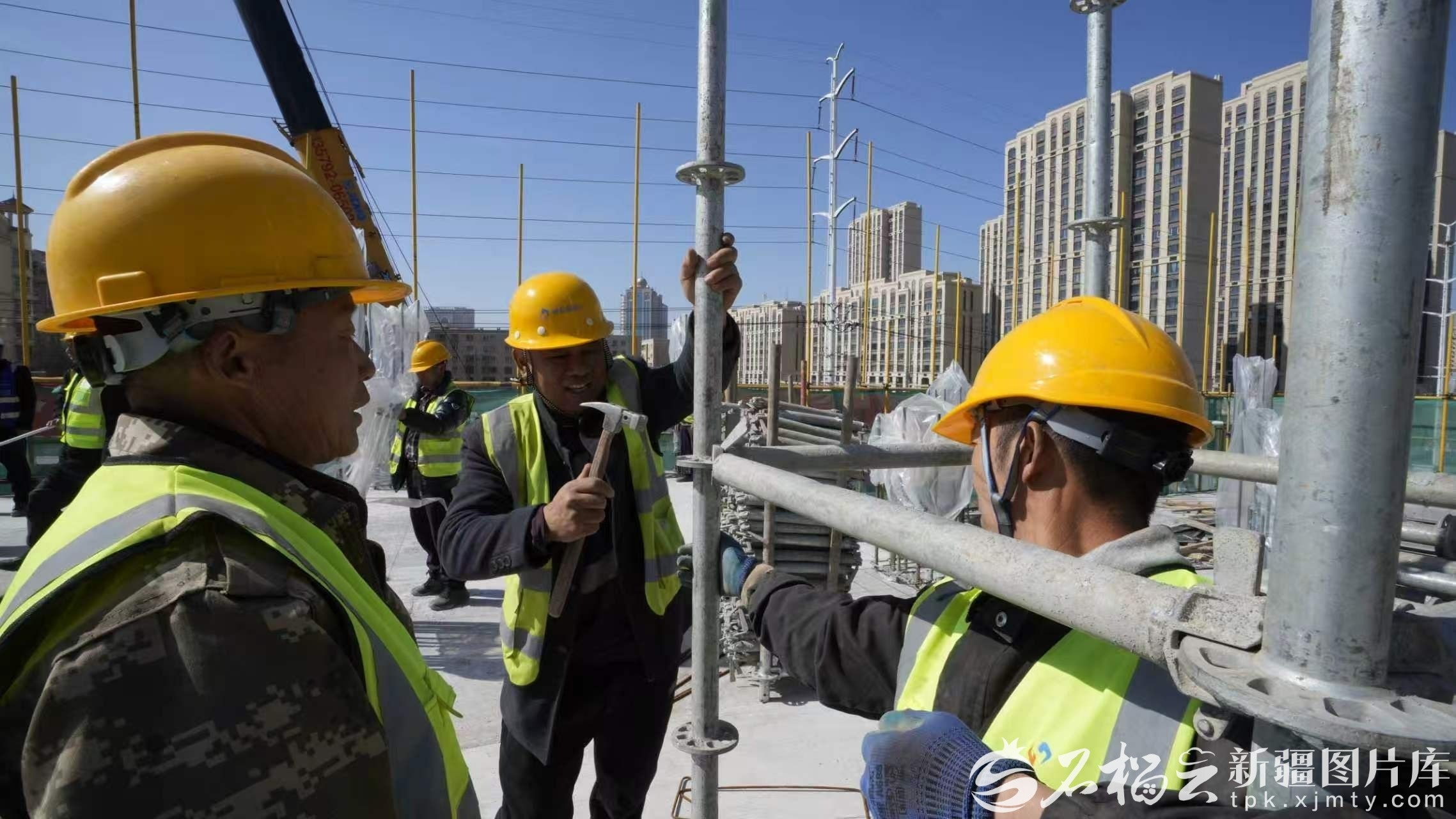3月23日,中湾街商业步行街项目建设现场2号合院商业楼区,施工人员搭设盘扣架体。李嘉华 摄
