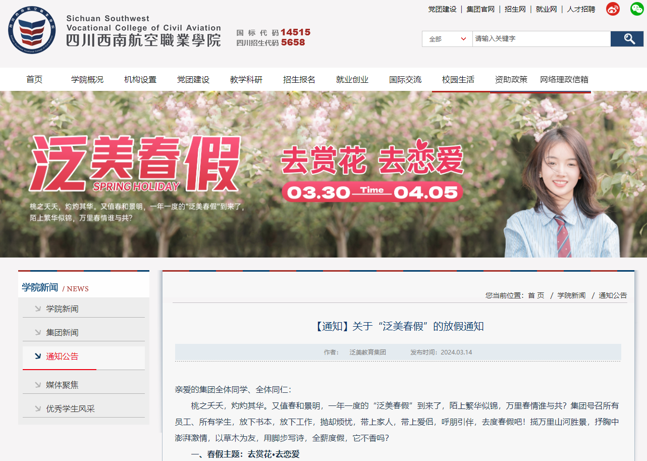 近日,四川西南航空职业学院发布春假通知,自4月1日至6日共六天时间,主题是“去赏花,去恋爱”,师生同休。