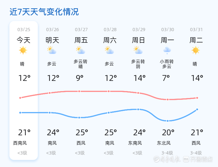 明日3月26日,临沂市天气将转为多云,与今日相比,气温有所上升,最高气温可达24℃,最低气温仍为12℃。风向转为南风,风力较今日略有增强,但整体仍为<3级,市民可适当增减衣物,注意天气变化。