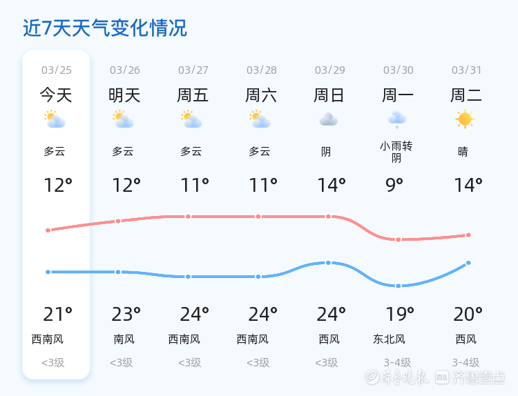 今天是3月25日,星期三,农历二月初七。枣庄市今日天气多云,气温在12℃至21℃之间,北风0级,空气湿度88%,PM2.5指数为120。各区天气情况基本一致,均为多云,气温在12℃至21℃左右。