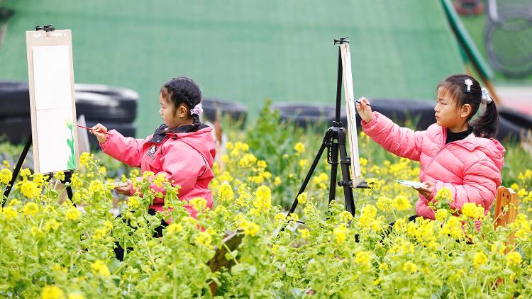 ▲3月20日,江苏泗洪县的小朋友在绘制海报
