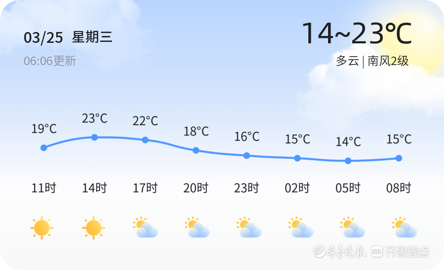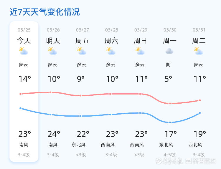 今天是3月25日,星期三,农历二月初七。聊城市今日以多云天气为主,气温较为适宜,全市最高气温为23℃,最低气温为14℃。目前实时温度为9.9℃,南风2级,空气湿度为80%,PM2.5指数为127。总体来看,全市各区天气状况基本一致,均为多云天气,风力较为温和,适合市民户外活动。
