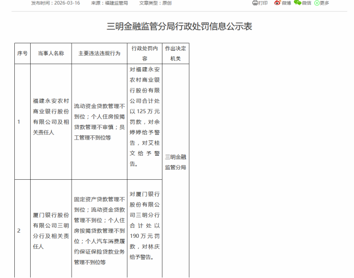 3月16日,国家金融监督管理总局三明金融监管分局公布的行政处罚信息公示表显示,厦门银行三明分行存在固定资产贷款管理不到位、流动资金贷款管理不到位、个人住房按揭贷款管理不到位、个人汽车消费履约保证保险贷款业务管理不到位等问题,三明金融监管分局对厦门银行三明分行合计处以190万元罚款,对相关责任人林庆给予警告。