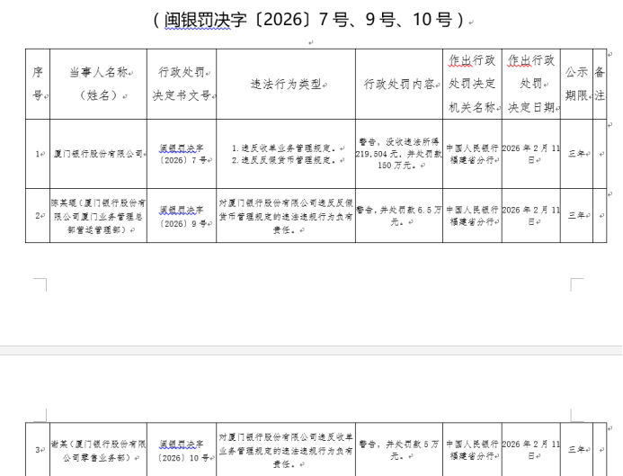 2月11日,中国人民银行福建省分行接连开出3张行政处罚决罚决字〔2026〕7号、9号、10号),“剑指”厦门银行及相关责任人。根据中国人民银行福建省分行发布的行政处罚信息,厦门银行因违反收单业务管理规定、违反反假货币管理规定,被警告、没收违法所得21.95万元,并罚款150万元,两名相关责任人也被处以警告并合计罚款11.5万元。