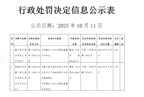 此前,厦门银行也曾在一天内收到多张罚单。2025年10月11日,中国人民银行厦门市分行官网发布行政处罚决定信息公示表,厦门银行三家支行被处罚。其中,海沧支行、同安支行被警告,开元支行被警告并罚款66万余元。厦门银罚决字〔2025〕7号、9号显示,因对预算收入划分办理监督履行不到位,厦门银行海沧支行、同安支行均被警告。同日发布的厦门银罚决字〔2025〕8号、10号显示,厦门银行开元支行因对预算收入划分办理监督履行不到位,被处以警告并罚款661324元。同时,因对开元支行该违法违规行为负有直接责任,一名相关责任人被警告并罚款98397元。