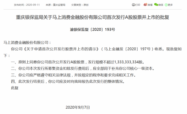 2020年9月7日,原重庆银保监局公布对马上消费金融首次发行A股股票并上市的批复。批复显示,原则上同意其首次公开发行A股股票,发行规模不超过13.33亿股;本次发行所募集资金扣除发行费用后,应全部用于补充其核心一级资本。2021年1月,中金公司、中信建投作为其IPO辅导机构,首次报送了辅导备案登记材料。