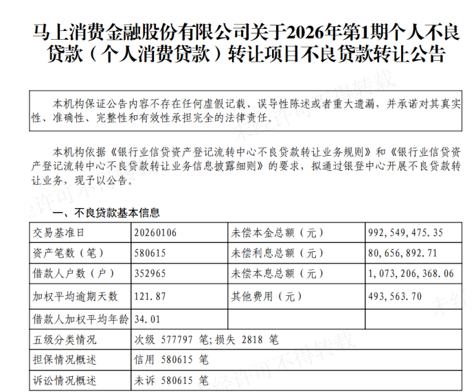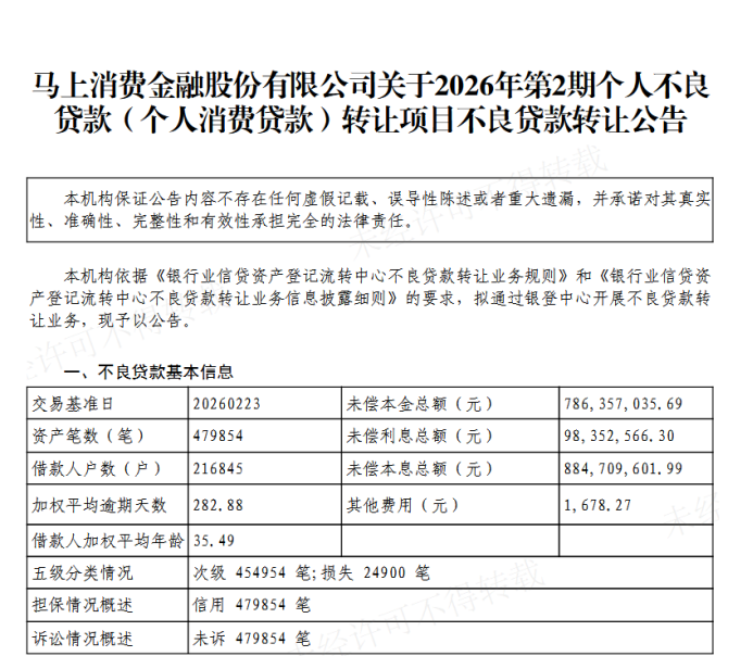 业绩逐步扩张的同时,马上消费金融也在加速出清不良资产。2026年以来,马上消费金融已发布两期个人不良贷款转让公告,两期资产包内的该资产包未偿本息总额约为19.54亿元。1月27日,马上消费金融通过银登网26年第1期个人不良贷款(个人消费贷款)转让项目不良贷款转让告显示,该资产包未偿本息总额约为10.73亿元,资产笔数约为58万笔,其中次级贷款约为57.8万笔,均未发起诉讼。此外,该资产包的加权平均逾期天数仅121.87天,借款人平均年龄34岁。3月13日,马上消费金融26年第2期个人不良贷款(个人消费贷款)转让项目不良贷款转让公告。公告显示,该资产包未偿本息总额约为8.84亿元,资产笔数超47万笔。