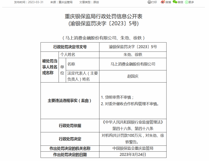 除了面临用户投诉,马上消费金融也曾受到监管处罚。2023年3月31日,原重庆银保监局对马上消费金融开出一张罚单:因贷前审查不审慎、对委外催收合作机构管理不审慎,马上消费金融被罚100万元,两名相关责任人被警告。