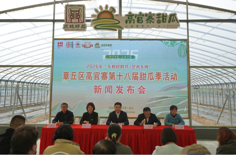 3月24日,济南市章丘区2026年“乡村好时节·艺术乡间”主题年活动暨章丘区高官寨第十八届甜瓜季新闻发布会举行。据悉,本届甜瓜季启动仪式将于本周在高官寨甜瓜精品园举行。发布会上还公布了第十八届甜瓜季的系列活动安排,活动聚焦甜瓜产业发展核心,揭秘了高官寨甜瓜的“当家品种”,以及本土种苗企业伟丽种苗如何立足本地特色,以科技赋能产业、带动农民增收的实践路径。