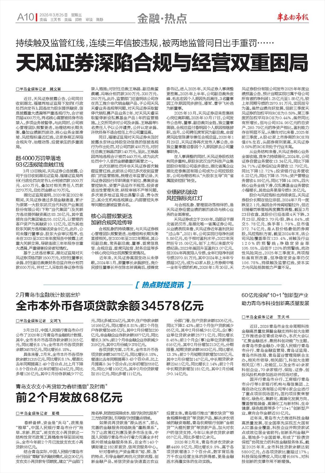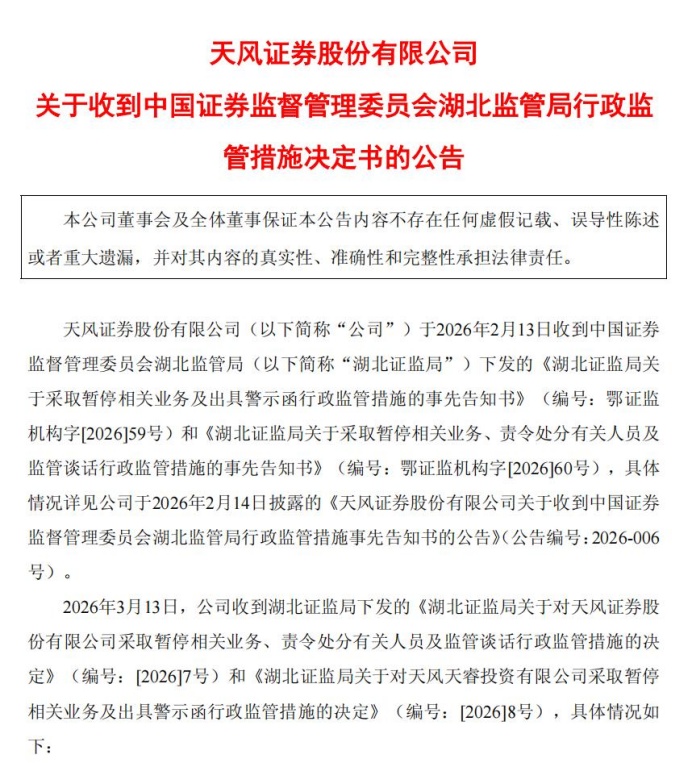 持续触及监管红线,连续三年信披违规,被两地监管同日出手重罚……天风证券深陷合规与经营双重困局