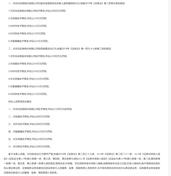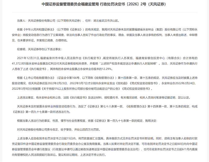 同日,福建证监局对天风证券未及时披露永安林业持股变动信息的信披违规行为作出处罚,对公司罚款400万元,对时任总裁王琳晶罚款140万元。至此,王琳晶因两地违规合计被罚440万元,成为此次处罚中个人受罚金额最重的高管之一。