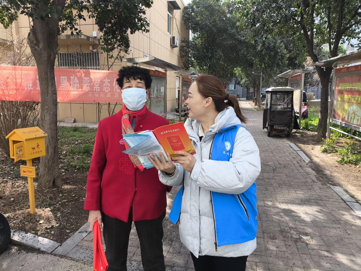 网格员身着蓝马甲,在小区广场、楼栋单元口等人流密集区域设立宣传点,向居民发放《民法典知识手册》《生活中的民法典》等宣传材料,并围绕婚姻家庭、遗产继承、物业纠纷、高空抛物等热点问题,结合实际案例进行通俗讲解。针对老年居民关心的防诈骗问题,网格员还特别提醒他们警惕“以房养老”“保健品推销”等陷阱,守好“钱袋子”。