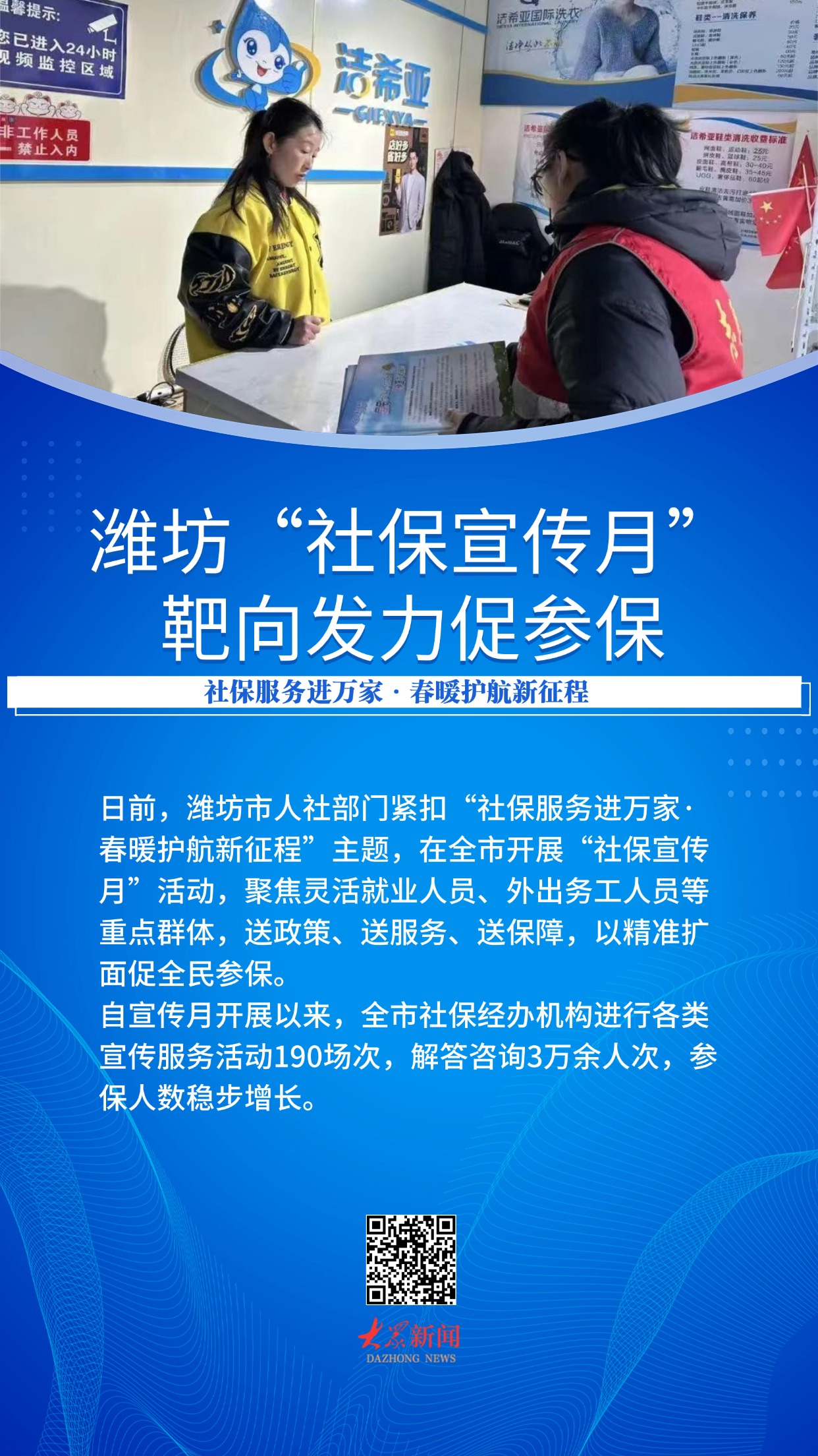 自宣传月开展以来,全市社保经办机构进行各类宣传服务活动190场次,解答咨询3万余人次,参保人数稳步增长。下一步,潍坊市将推动社保政策宣传从“集中式”向“常态化”转变,持续深化全民参保。