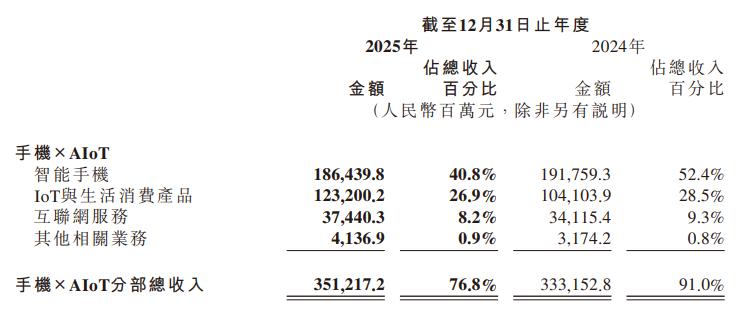 其中智能手机业务收入为1864亿元,同比下降2.8%,毛利率为10.9%,同比减少1.7个百分点;小米智能手机2025年的出货量为165.2百万台,同比减少2%,出货量连续第五年排名全球前三,市场份额为13.3%。