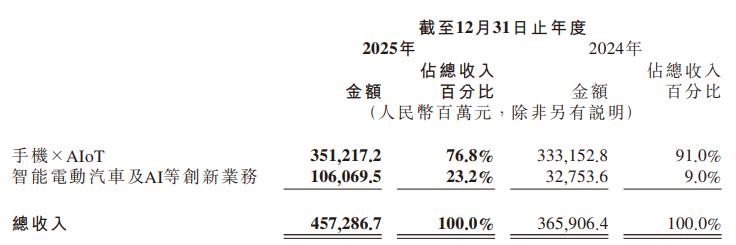 小米集团2025年汽车收入增长两倍至1033亿元,单车均价约25万元,手机业务收入下滑