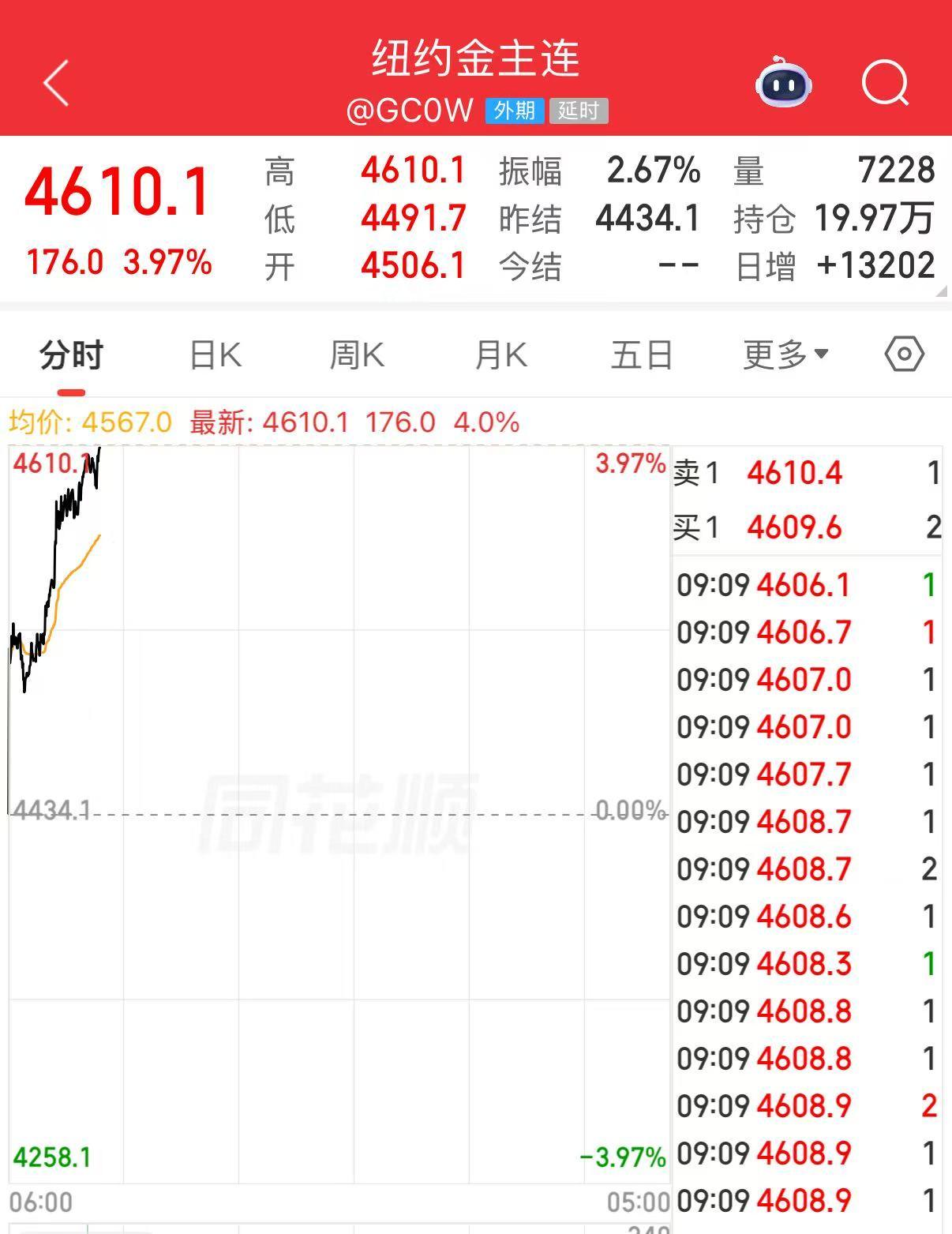 其中,COMEX黄金期货上涨3.97%,收复4600美元/盎司。
