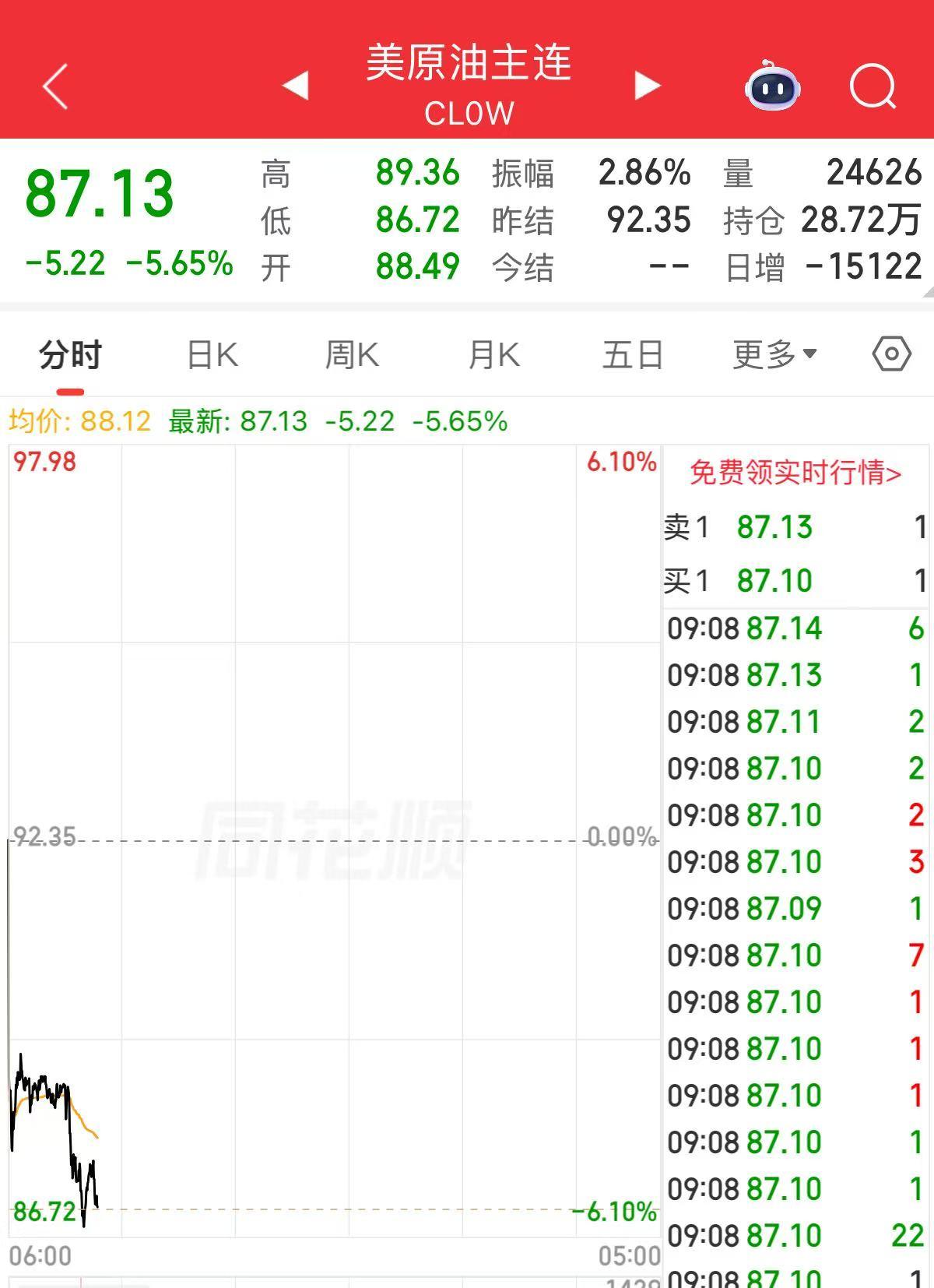 国际油价大幅跳水。WTI原油期货跌破90美元/桶关口,最新报87.13美元/桶,日内下跌5.65%。