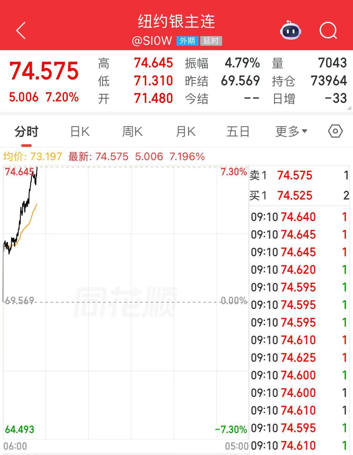COMEX白银期货大涨7.2%,报74.575美元/盎司。