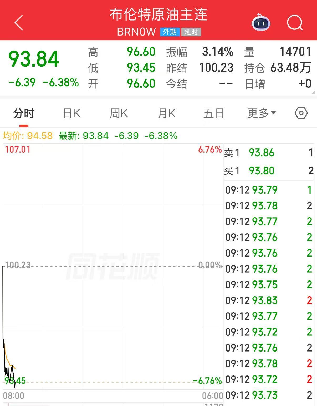 布伦特原油报93.84美元/桶,日内下跌6.38%。