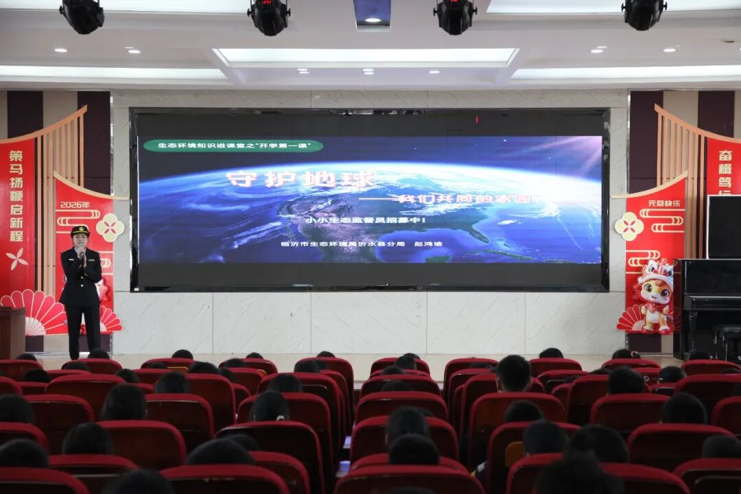 宣讲现场,宣讲人员以生动比喻拆解地球生态体系,让孩子们直观理解森林、湿地、江河等生态载体的重要作用;通过播放公益短片,带领大家感受地球壮美,领悟万物共生的意义。宣讲团还围绕“地球妈妈发来的SOS”主题,剖析当前生态困境与隐性污染危害,讲解垃圾分类知识,让同学们深知环保刻不容缓。