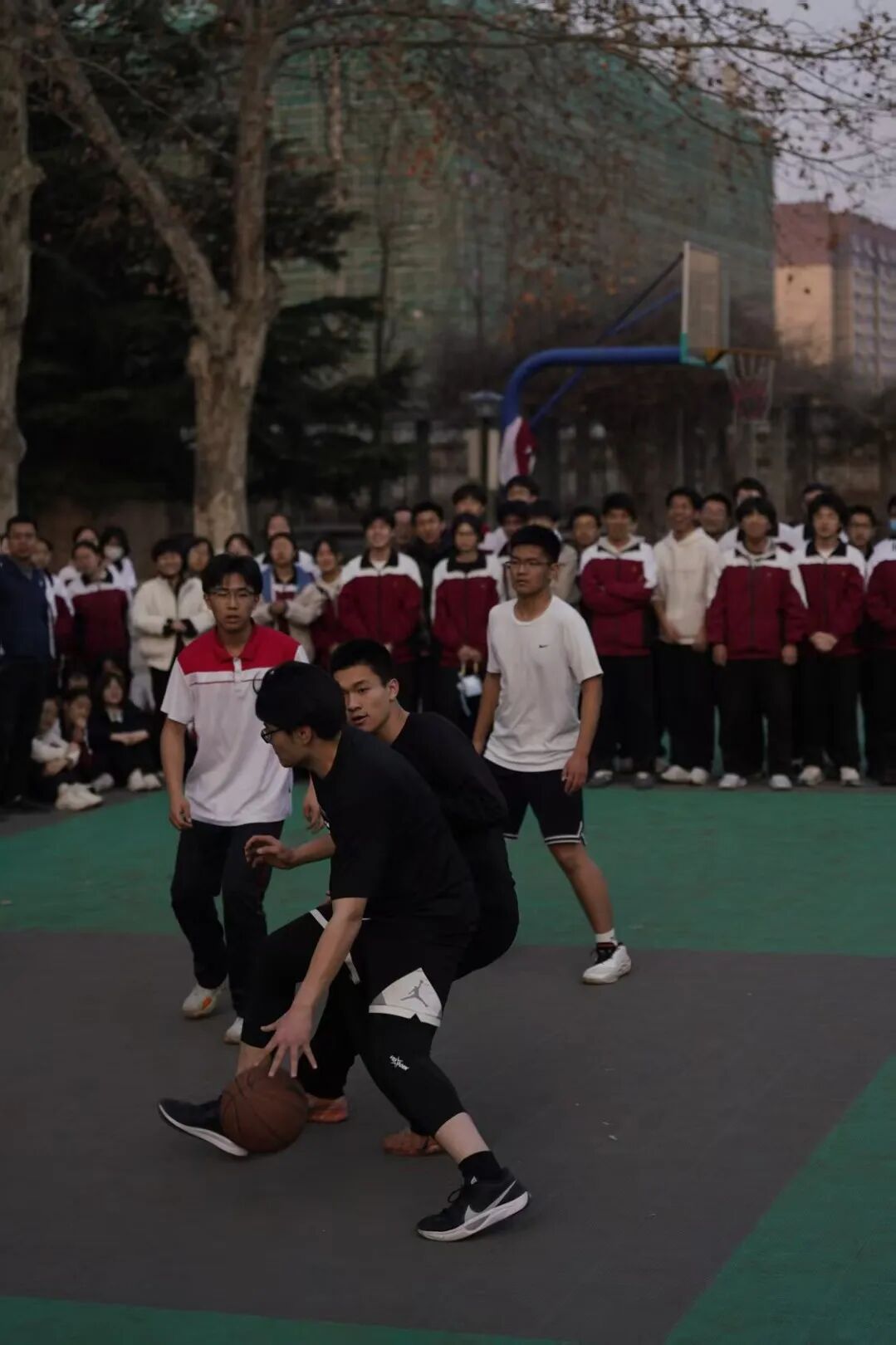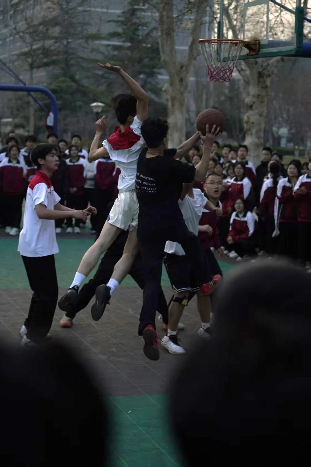 哨声吹响,战幕开启。赛场上,各班健儿身姿矫健、步履如风,传球、运球、突破、投篮,每一个动作都利落干脆;跳跃、奔跑、卡位、防守,每一次拼抢都全力以赴。默契的团队配合,精准的远投三分,精彩的攻防转换,让现场欢呼声、呐喊声此起彼伏,掌声与喝彩声交织成最热烈的赛场乐章。