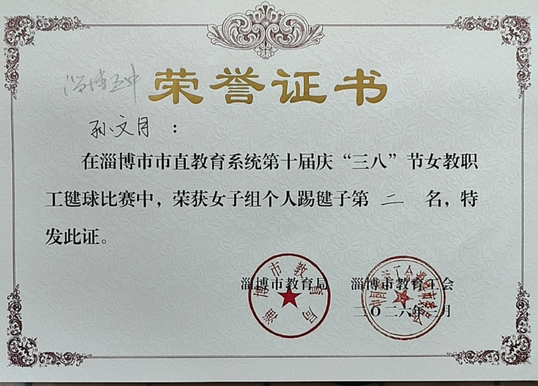 3月21日,市直教育系统第十届女教职工毽球比赛在淄博实验中学举行。经过激烈角逐,淄博五中代表队凭借默契配合和出色发挥,荣获毽球比赛团体项目冠军。孙文月老师荣获女子个人组第二名。