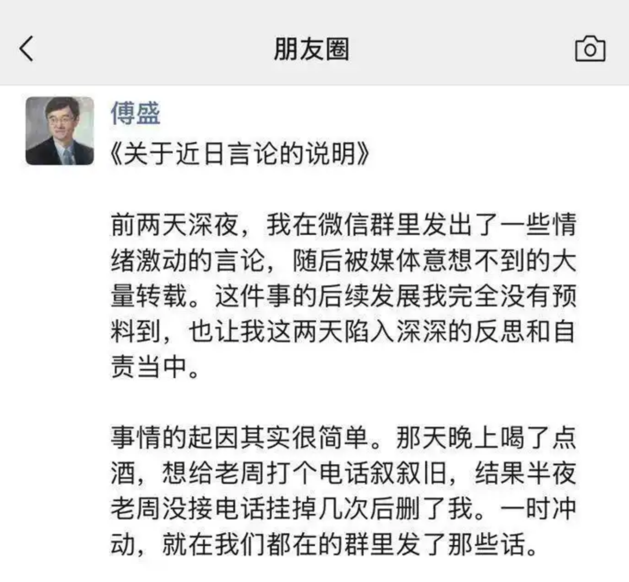 据多家媒体报道,在3月24日发布的朋友圈长文中,傅盛解释称,他当天喝了些酒,本想给周鸿祎打电话叙旧,但因电话未获接听、数次被挂断后又被对方删除好友,自己一时冲动,才在双方共同所在的群内发布了相关过激言论。