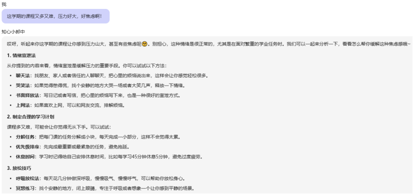 融合现代心理学与中医情志理论,当学生感到焦虑、抑郁时,“知心小郎中”能精准分析学生状态,提供科学的情绪疏导方法,帮助学生找回内心的平静。