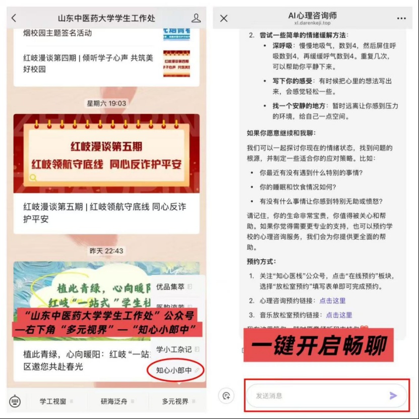 进入“山东中医药大学学生工作处”微信公众号,点击底部菜单栏【多元视界】→【知心小郎中】,一键开启畅聊!