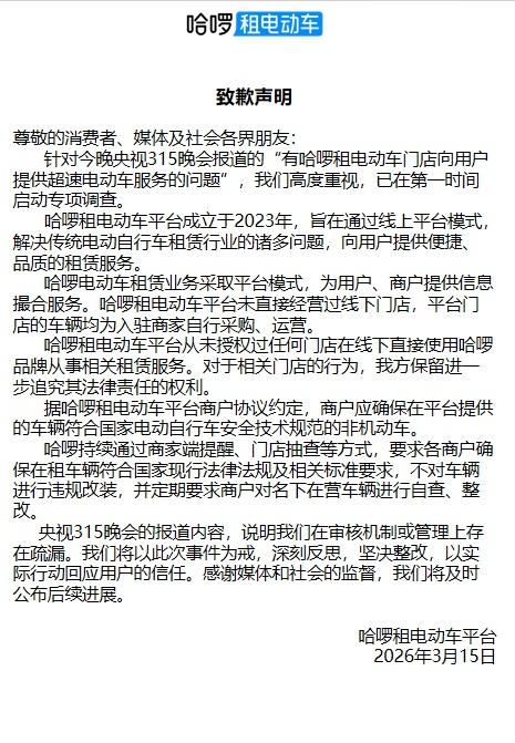 当晚,哈啰租电动车平台发布《致歉声明》。声明称,针对今晚央视315晚会报道的“有哈啰租电动车门店向用户提供超速电动车服务的问题”,其高度重视,已在第一时间启动专项调查。