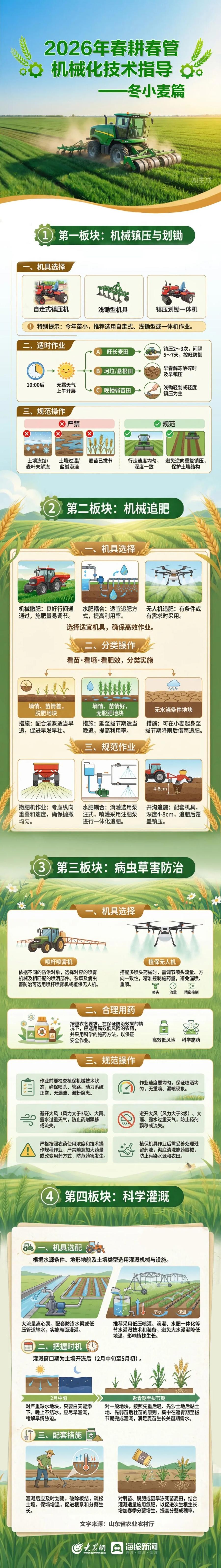 为保障全省春管工作科学高效开展,山东省农业农村厅日前印发了《2026年主要农作物春耕春管机械化技术指导意见》,围绕冬小麦的机械镇压与划锄、机械追肥、病虫草害防治、科学灌溉等关键环节,明确了机具选型、作业时机和技术要求,为各地分类施策、精准作业提供了有力支撑。