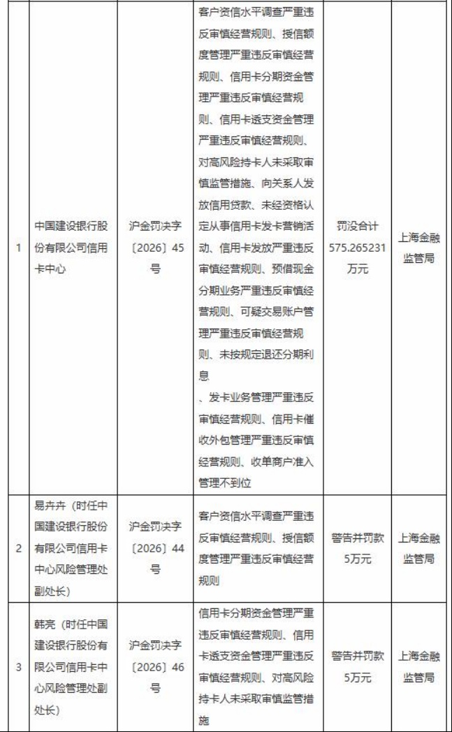 3月23日,国家金融监督管理总局上海监管分局发布的行政处罚信息显示,中国建设银行股份有限公司信用卡中心因14项违规被罚没合计575.265231万元。